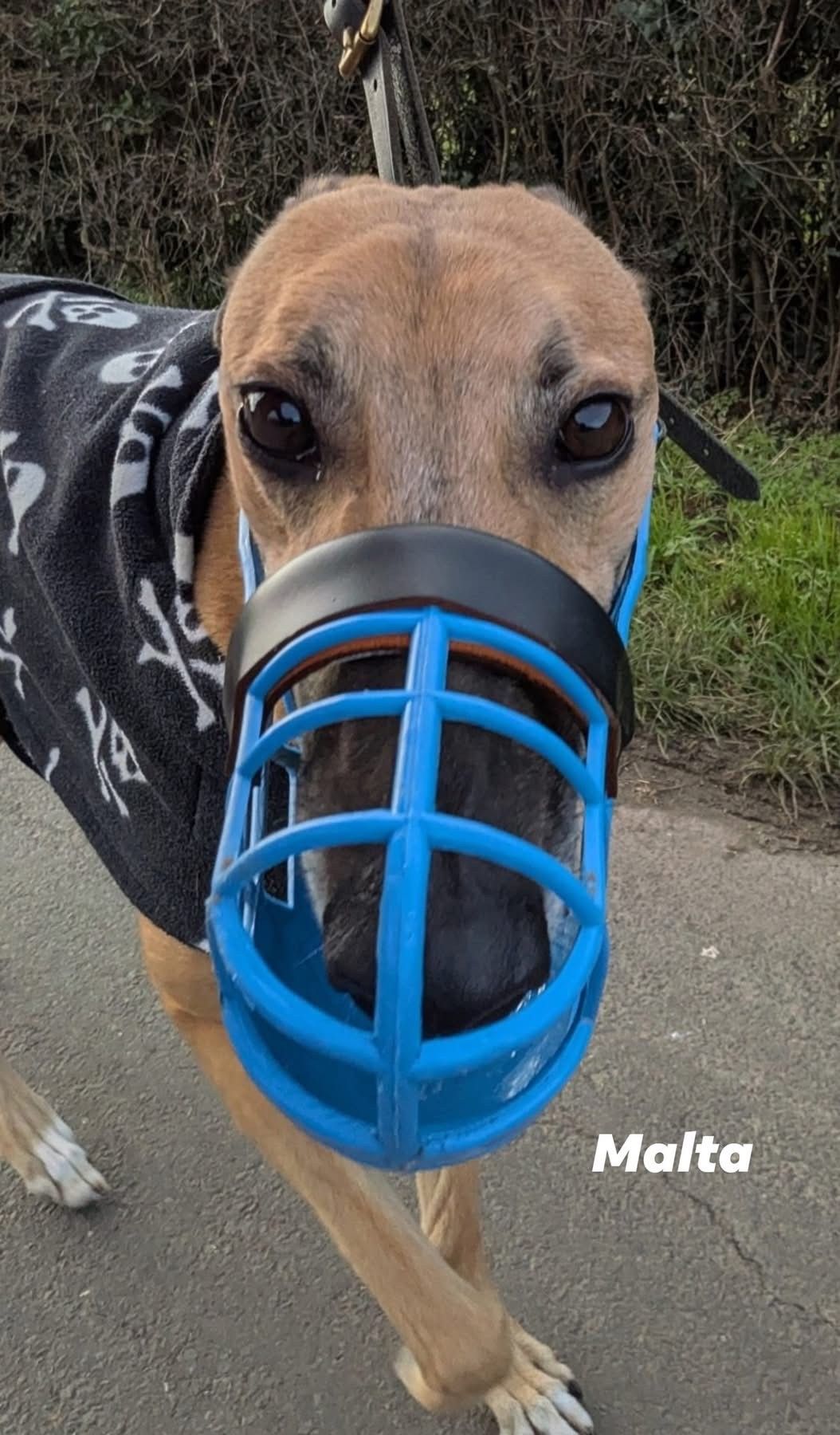 Malta has improved on walks since he first arrived in September 2025 and is getting better with his reaction to seeing non-greyhounds. He doesn’t have any issue going on group walks with other greyhounds, he just doesn’t want to share his space with another.